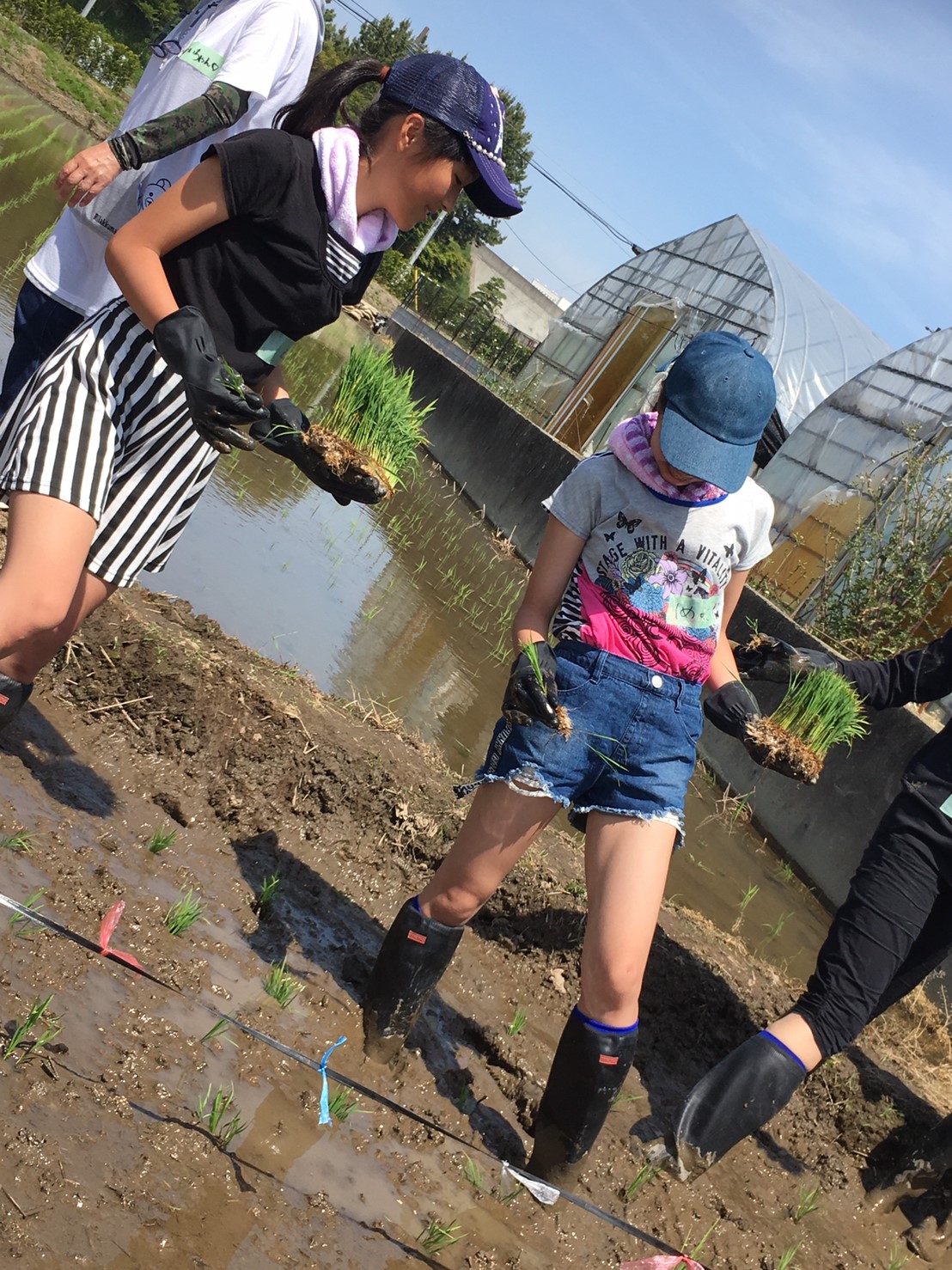 いよいよ田植え開始です!初めのうちは泥にはまった足を抜くのも大変!あっちにふらふら、こっちにふらふら。ですが次第にコツをつかみ始め後半はリズムよく田植えができました。