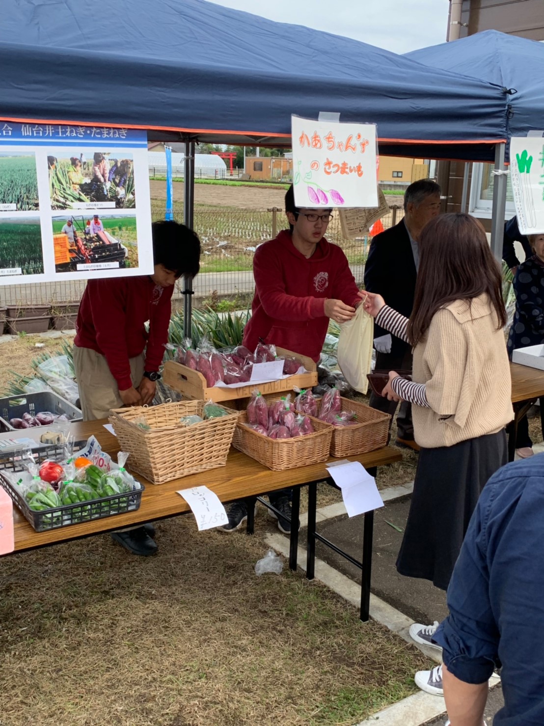 野菜販売では、地元農家さんが丹精込めて作ってくださったお野菜を販売しました来てくださった方に、若林区沿岸部のお野菜だということを伝えると、興味を持っていただけました♪