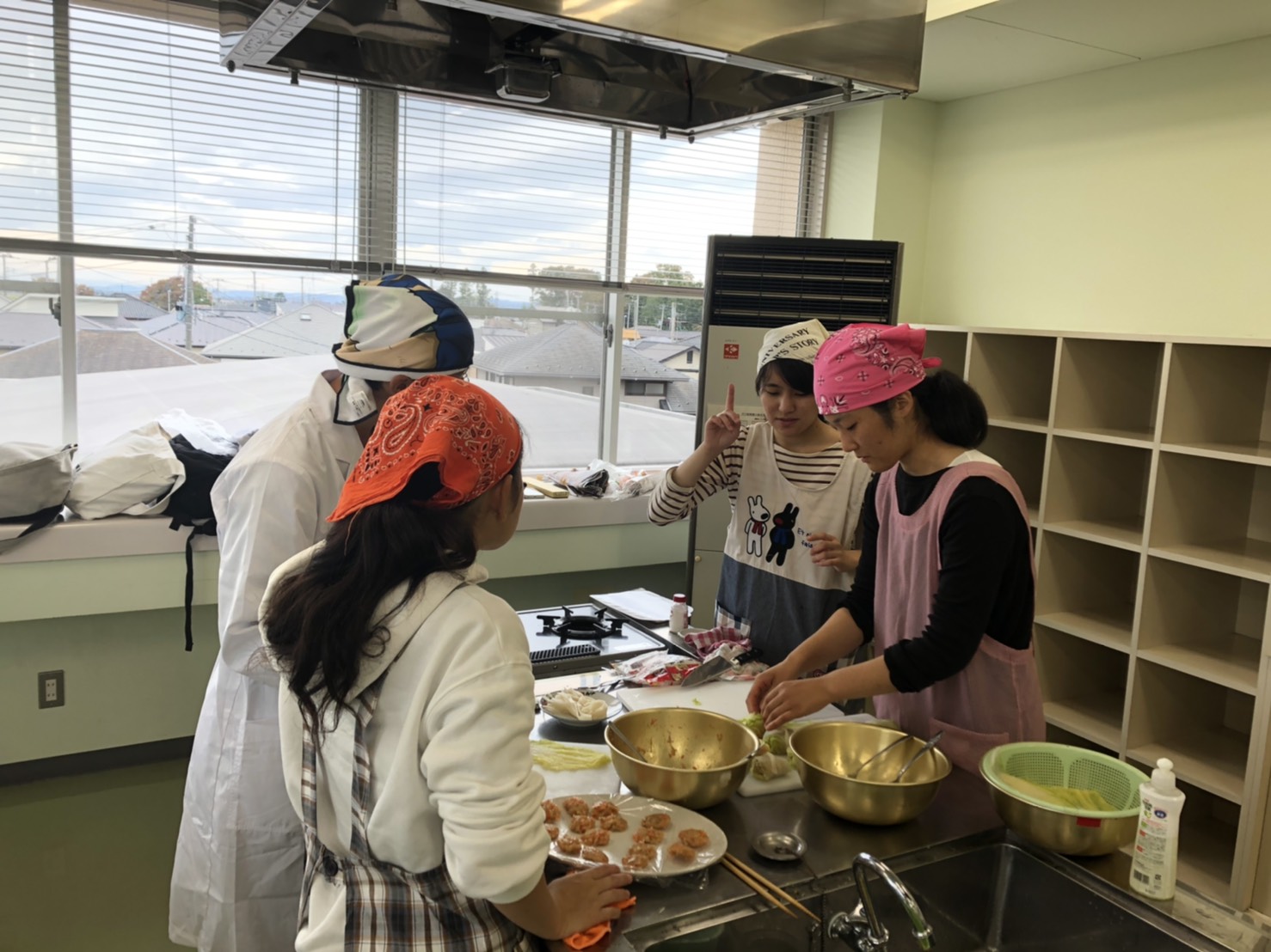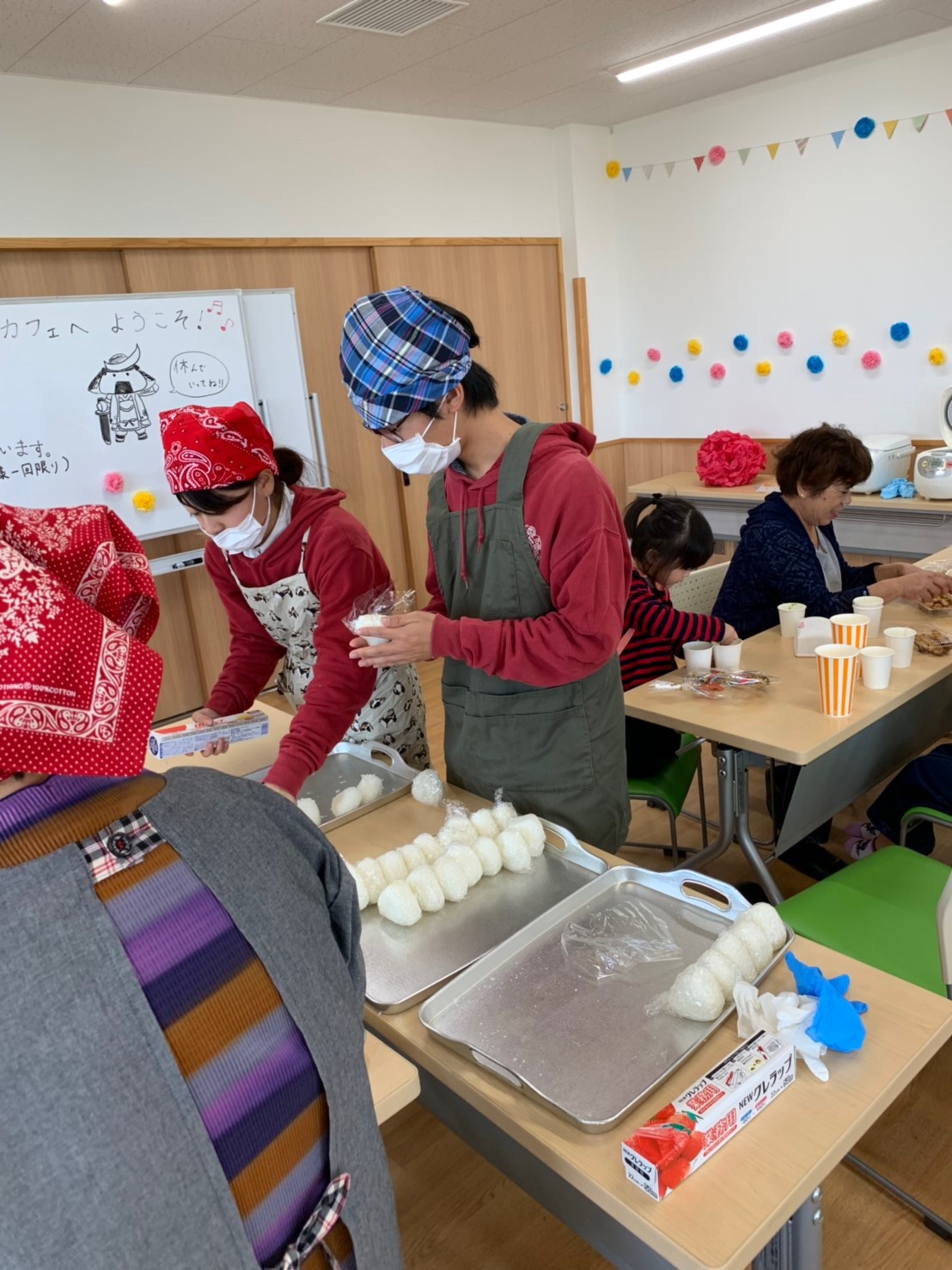休憩室のカフェでは地域のお母さん方がおいしい芋煮やおにぎり、ずんだ餅などを振る舞っていました。私たちもちょこっとお手伝いしました。